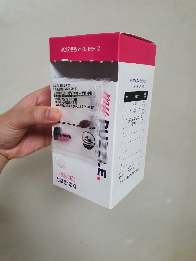 "나만의 맞춤형 데일리 영양제, 마이퍼즐"이전에는 각기 다른 영양제통을 구비해놓고 챙기거나 소분작업을 직접해서 챙겼었는데, 마이퍼즐이 짠하고나타나주었습니다! 제가 기존에 영양제만 6개 넘게 먹고있었는데 마이퍼즐 약사님과 상담하에 3개로 줄였네요ㅎㅎ과유불급인것을 이번 기회에 알게 되었습니다!꼼꼼이 상담해주셔서 나만의 영양제가 만들어졌고벌써 5회차 함께하고 있어요:) 다들 책상위에 있는마이퍼즐 보고 뭐냐고 물어보길래 홍보 열심히 하고 있는중입니다! 마이퍼즐 앞으로도 함께해요~~~!